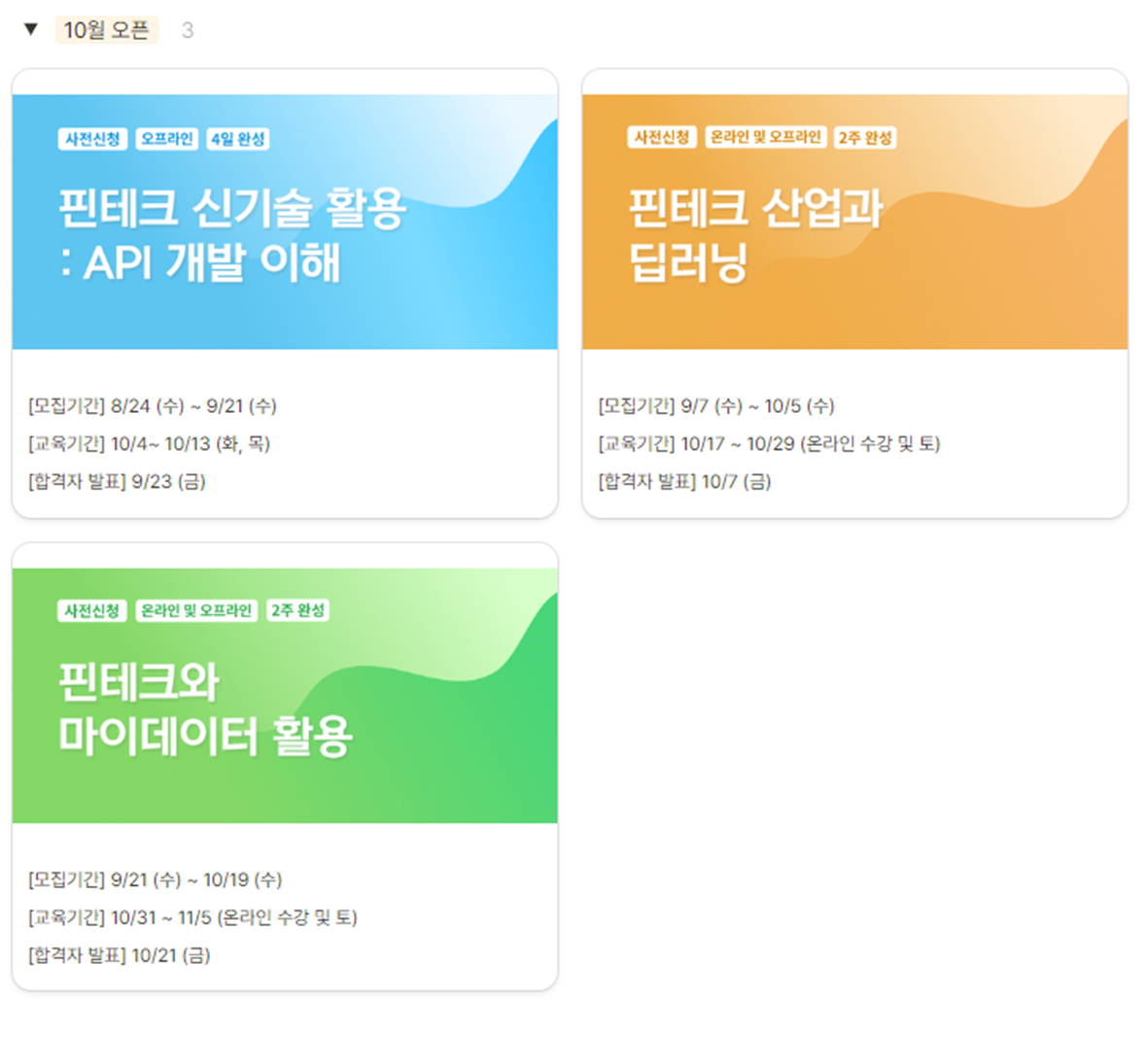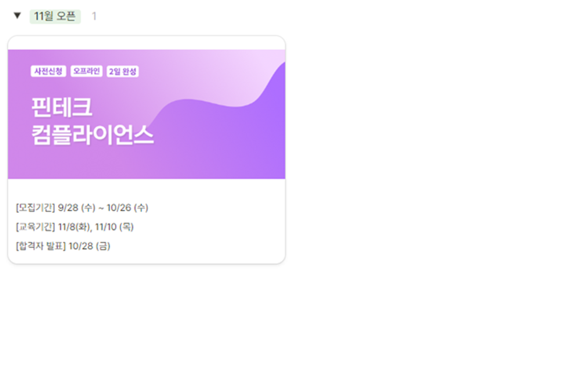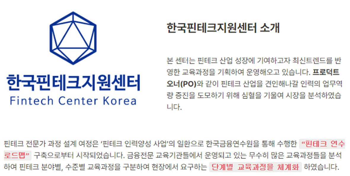 한국핀테크지원센터는 핀테크 산업 성장에 기여하고자 최신트렌드를 반영한 교육과정을 기획하여 운영해오고 있습니다.