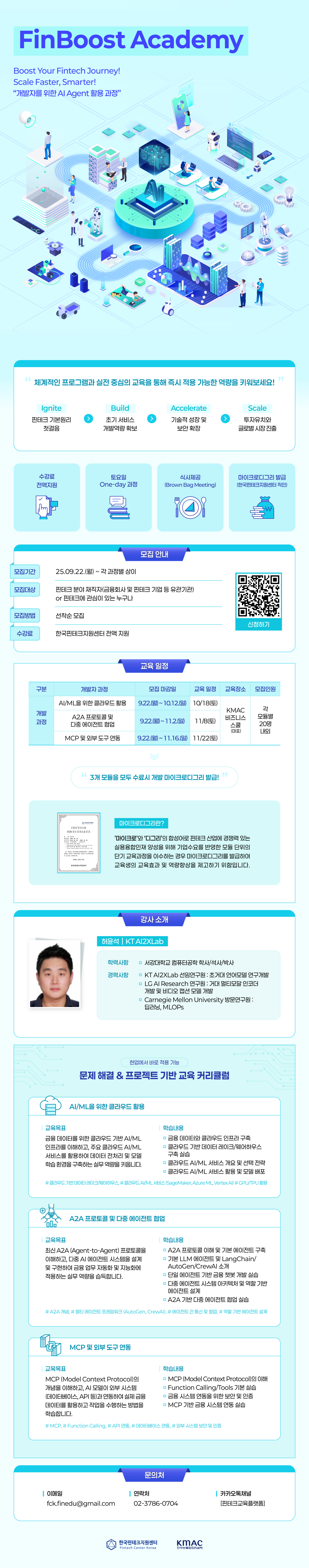 2025년 핀테크 전문가 과정 ‘FinBoost Academy 개발자 교육'이 아래 일정으로 진행되오니 많은 관심과 참여 바랍니다.